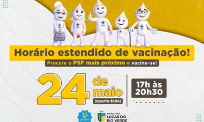 A Secretaria de Saúde de Lucas do Rio Verde informa que, nesta quarta-feira (24), terá vacinação em horário estendido, das 17h às 20h30, em nove unidades...