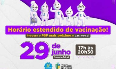 A Secretaria de Saúde de Lucas do Rio Verde informa que, nesta quinta-feira (29), terá vacinação em horário estendido, das 17h às 20h30, em dez unidades...