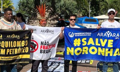 Um grupo de manifestantes protestou, nesta quarta-feira (13), contra o leilão de áreas de exploração de petróleo e gás natural, feito pela Agência Nacional do Petróleo, Gás Natural e...
