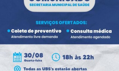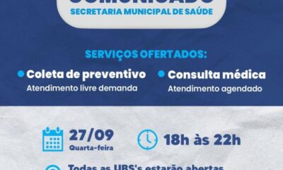 A Secretaria de Saúde informa que nesta quarta-feira (26), as UBS’s terão horário de atendimento estendido. Serão ofertados coleta de preventivo (papanicolau), com atendimento livre demanda,...