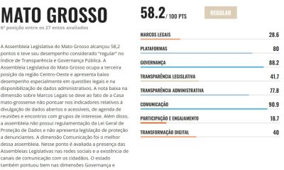 A Assembleia Legislativa de Mato Grosso é a sexta mais transparente do país, segundo ranking divulgado nesta quinta-feira (25) pela Transparência Internacional – Brasil. Para elaboração...