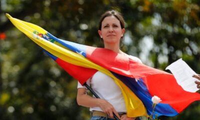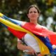 Reprodução Líder da oposição e deputada María Corina Machado com bandeira venezuelana durante protesto em frente à sede da Guarda Nacional Bolivariana em Caracas no ano...