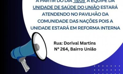 A partir de hoje, 15 de maio, o atendimento da equipe do Programa de saúde da Família (PSF) do bairro União tem um novo endereço. Os...
