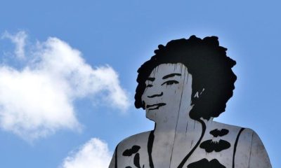 Tânia Rêgo/Agência Brasil – 14/03/2023 Escultura de 11 metros de altura, do artista plástico Paulo Nazareth, em homenagem a Marielle Franco, no pilotis do Museu de...