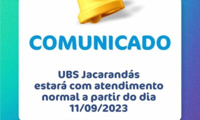 A Secretaria de Saúde informa que os atendimentos na Unidade Básica de Saúde Jacarandás, serão retomadas a partir desta segunda-feira (11). A unidade foi a 17º...