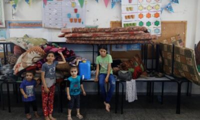 UNICEF/UNI448946/El Baba No último dia 8 de outubro, crianças palestinas aguardam dentro de um quarto em um abrigo de emergência na Faixa de Gaza Mais de...