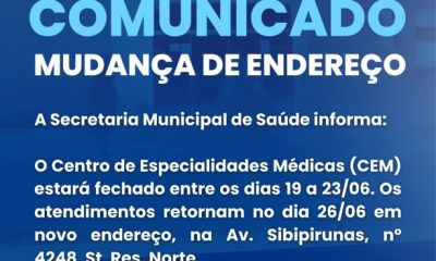 A Secretaria de Saúde informa que o Centro de Especialidades Médicas (CEM), estará fechado entre os dias 19 à 23/06, por motivos de mudança de prédio....