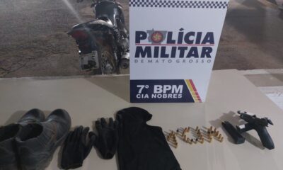 Policiais militares de Nobres prenderam em flagrante um homem de 20 anos por porte ilegal de arma de fogo, direção perigosa e adulteração de veículo, na...