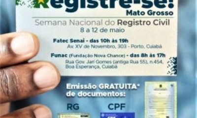 A 1ª Edição da Semana Nacional do Registro Civil – Registre-se! já começou. A iniciativa conta com apoio da Prefeitura de Cuiabá que é parceira da...