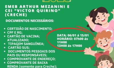 As matrículas para alunos da rede municipal de ensino poderão ser feitas no período de 06 a 15 de janeiro de 2025, nas unidades escolares de...