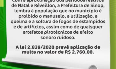 A Prefeitura de Sinop, com a aproximação dos períodos festivos de Natal e Réveillon, lembra à população que no município é proibido o manuseio, a utilização,...