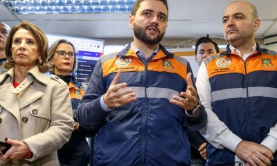 O governador em exercício do Rio Grande do Sul, Gabriel Souza (ao centro), informou, em entrevista coletiva nesta quinta-feira (13), que o estado continua em alerta...