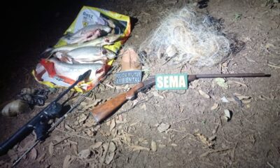A Secretaria de Estado de Meio Ambiente (Sema-MT) aplicou R$ 61 mil em multas e apreendeu 371 kg de pescado, um jacaré e uma arma de...