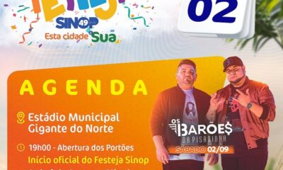 Os Barões da Pisadinha vão dar o play nas comemorações dos 49 anos do município. O show será após a abertura oficial do Festeja Sinop e...