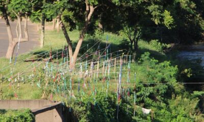 No Rio Paraopeba, em Brumadinho (MG), varas de bambu com panos coloridos preenchem uma das margens e a ponte que passa por cima das águas. Imagens...