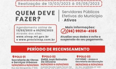 O Censo Previdenciário do PreviSinop está na reta final. Servidores ativos efetivos devem fazer o recadastramento que se encerra amanhã, sexta-feira (05). Os atendimentos referentes ao...