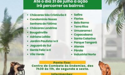 O Departamento de Endemias, da Secretaria de Saúde, segue com a campanha de vacinação antirrábica itinerante pelos bairros e zona rural de Sinop. Os trabalhos tiveram...