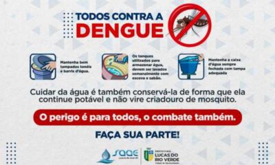 Com a crescente proliferação do mosquito da dengue no município, o Serviço Autônomo de Água e Esgoto (Saae) de Lucas do Rio Verde, vem alertar a...