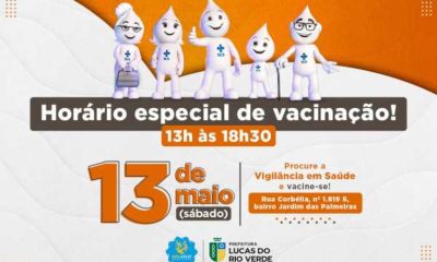 A Secretaria de Saúde de Lucas do Rio Verde informa que, neste sábado (13), terá vacinação, das 13h às 18h30, na Vigilância em Saúde. Os imunizantes...