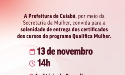 A Prefeitura de Cuiabá, via Secretaria Municipal da Mulher, certifica mais 117 mulheres, pelo Programa Qualifica Mulher de capacitação profissional. O evento ocorre nesta quarta-feira (13),...