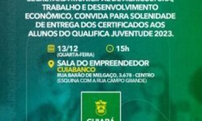 A Prefeitura de Cuiabá, por meio da Secretaria Municipal de Agricultura, Trabalho e Desenvolvimento Econômico, entregará os certificados para alunos formados nos cursos oferecidos pelo programa...
