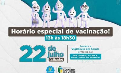 A Secretaria de Saúde de Lucas do Rio Verde informa que, neste sábado (22), terá vacinação, das 13h às 18h30, na Vigilância em Saúde. Os imunizantes...