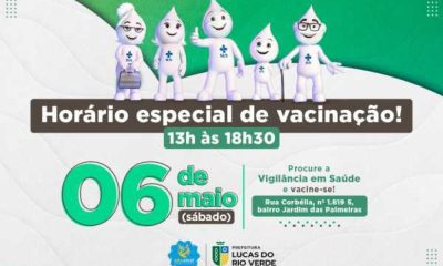 A Secretaria de Saúde de Lucas do Rio Verde informa que, neste sábado (06), terá vacinação, das 13h às 18h30, na Vigilância em Saúde. Os imunizantes...