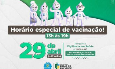 A Secretaria de Saúde de Lucas do Rio Verde informa que, neste sábado (29), terá vacinação, das 13h às 19h, na Vigilância em Saúde. Os imunizantes...