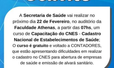 A Secretaria de Saúde vai realizar no próximo dia 22 de Fevereiro, um curso de capacitação para o Sistema CNES (Cadastro Nacional de Estabelecimentos de Saúde),...