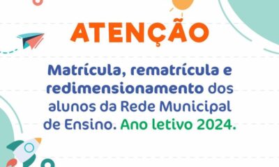 A Secretaria de Educação, Esporte e Cultura, informa os pais que devem ficar atentos ao período de matrícula, rematrícula e redimensionamento dos alunos da Rede Municipal...