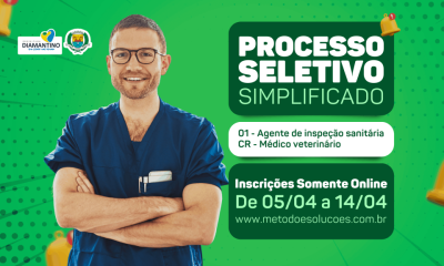 A Prefeitura Municipal de Diamantino torna público que a partir do dia 05 a 14 de abril estarão abertas as inscrições para o Processo Seletivo Simplificado...