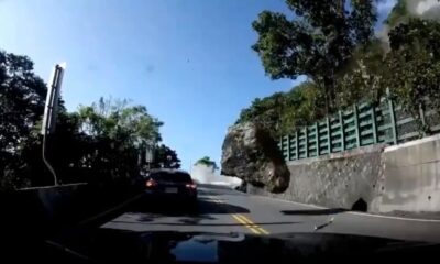 Reprodução/X Momento em que rocha cai e atinge traseira de um dos veículos. Vídeo do terremoto em Taiwan divulgado na quarta-feira (3) mostra motoristas sendo atingidos...