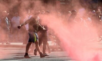 PETER POWELL/ AFP Manifestantes lançaram sinalizadores contra a polícia em Liverpool Milhares de policiais de choque do Reino Unido estão a postos nesta quarta-feira (7) para...