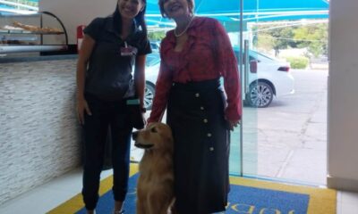 A presidente do Tribunal de Justiça de Mato Grosso, desembargadora Clarice Claudino da Silva, a vice-presidente, desembargadora Maria Erotides Kneip, receberam a visita do Fred, cão...