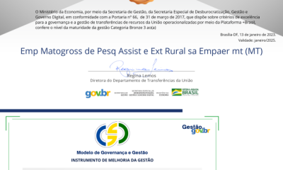 A Empresa Mato-grossense de Pesquisa, Assistência e Extensão Rural (Empaer) alcançou o nível da maturidade da gestão Categoria Bronze 3, conferida pelo Ministério da Economia, por...