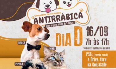 O Dia D da campanha antirrábica em Lucas do Rio Verde será no dia 16 de setembro (sábado), das 7h às 17h, em todos os PSFs...