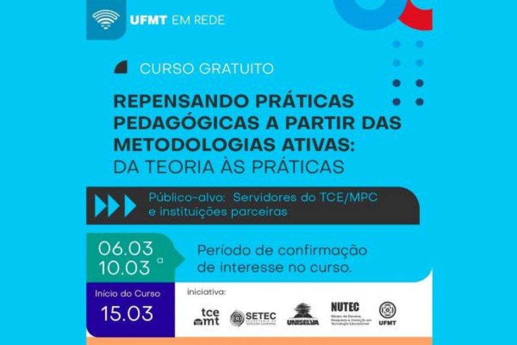 O Tribunal de Contas de Mato Grosso (TCE-MT) oferece, em parceria com a Universidade Federal de Mato Grosso (UFMT), o curso “Repensando práticas pedagógicas a partir das metodologias ativas: da teoria às práticas”. Realizada pela Escola Superior de Contas, a capacitação virtual tem início no dia 15 de março.
