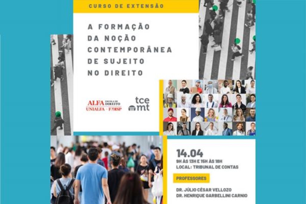 A Escola Superior de Contas do Tribunal de Contas de Mato Grosso (TCE-MT) promove, a partir das 9h desta sexta-feira (14), capacitação sobre a formação da noção contemporânea de sujeito de direito. Clique aqui para se inscrever.