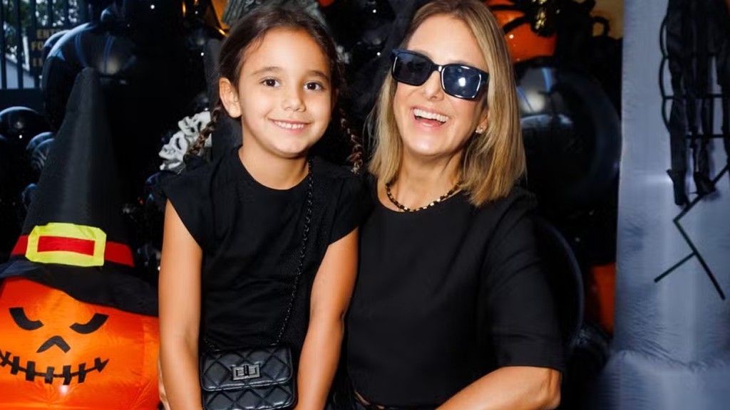 Ticiane Pinheiro, de 48 anos, levou a filha caçula Manuella, de 5 anos, que nasceu de seu casamento com o jornalista Cesar Tralli, de 53, a uma festa de Halloween em São Paulo, neste domingo (6).