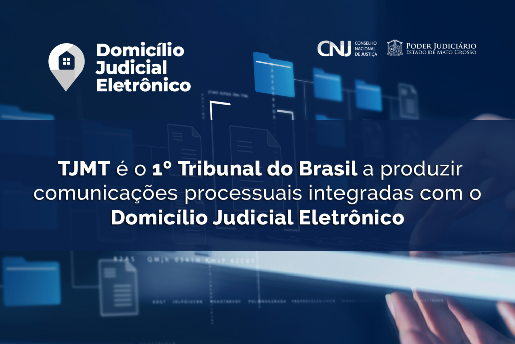 #Paratodosverem. Esta matéria possui recursos de texto alternativo para promover a inclusão das pessoas com deficiência visual. Descrição da iamgem: Arte digital em fundo azul com ícones que representam arquivos digitais. Marca do Domicial Judicial Eletrônico, CNJ e Poder Judiciário de Mato Grosso. Em destaque, ao centro da arte, o seguinte texto: TJMT é o 1º Tribunal do Brasil a produzir comunicações processuais integradas com o Domicílio Judicial Eletrônico
