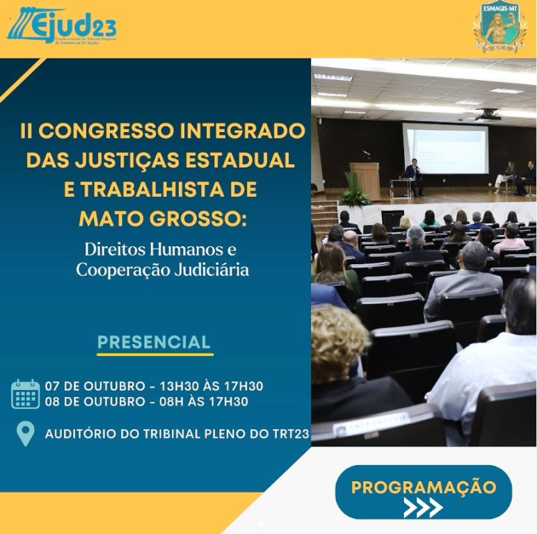 Organizado pela Escola Superior do Tribunal de Justiça (Esmagis-MT) e pela Escola Judicial do TRT, o evento é fruto da cooperação técnica firmada entre as duas instituições, visando ao aperfeiçoamento funcional mais amplo e diversificado dos magistrados e servidores.
