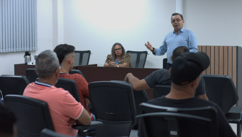 #Paratodosverem – Esta matéria possui recursos de texto alternativo para promover a inclusão das pessoas com deficiência visual. Foto 01: palestra sendo ministrada a agressores. Na foto, o palestrante está em pé, usa uma camisa xadrez azul clara e óculos. Ao seu lado uma mulher está sentada, ela tem cabelos grisalhos e usa blusa animal print. Os homens agressores estão sentados à frente do palestrante e ouvem atentamente, todos estão de costas e não estão identificados.