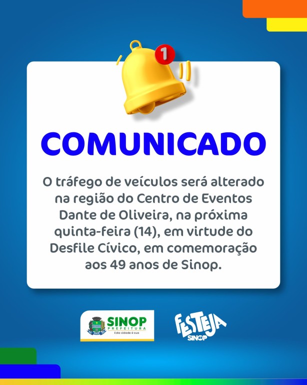 Em virtude do Desfile Cívico, que será realizado nesta quinta-feira (14), em comemoração aos 49 anos de Sinop, o tráfego de veículos será alterado na região do Centro de Eventos Dante de Oliveira. O desfile está previsto para iniciar às 16 horas e a alteração visa melhorar o fluxo e proporcionar mais segurança.