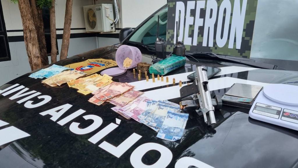 Na casa também foram encontradas porções e tabletes de pasta base e de maconha, acondicionadas no quarto, e munições da pistola, dois rádios comunicadores e balanças de precisão.