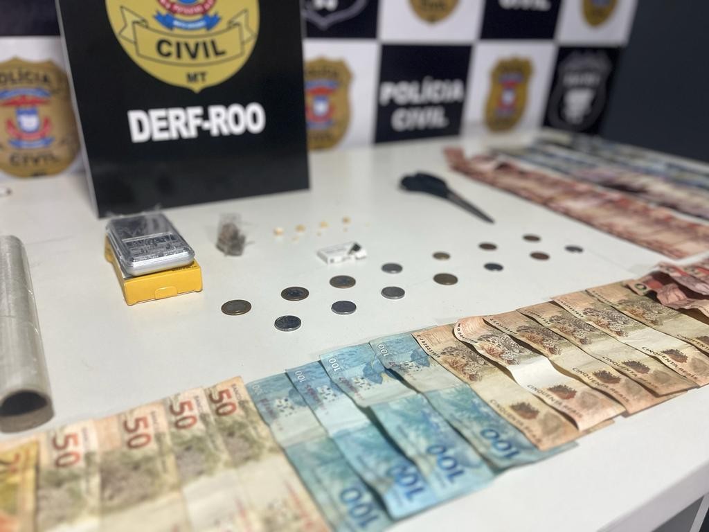 Com eles, a equipe da Delegacia de Roubos e Furtos de Rondonópolis apreendeu porções de pasta base e de maconha, uma motocicleta, aparelhos celulares e R$ 1.177 em notas de diversos valores.