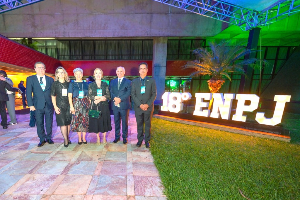 #Paratodosverem. Esta matéria possui recursos de texto alternativo para promover a inclusão das pessoas com deficiência visual. Foto 1: Mostra o certificado do Selo Ouro, com arte em amarelo e dourado onde se lê: Prêmio CNJ de Qualidade 2024 – Selo Ouro. O Conselho Nacional de Justiça concede o Prêmio CNJ de Qualidade 2024, Categoria Justiça Estadual Médio Porte, nos termos da Portaria CNJ nº 353/2023 ao Tribunal de Justiça de Mato Grosso. Campo Grande/MS, 03 de dezembro de 2024. Assina o ministro Luís Roberto Barroso – presidente do STF e CNJ. Foto 2: Na foto colorida panorâmica estão seis pessoas, três homens e três mulheres. Eles representam o TJMT no evento nacional dos Tribunais de Justiça, onde receberam o prêmio CNJ. Da esquerda para a direita estão o coordenador da Coordenadoria de Planejamento do TJMT, Afonso Maciel; assessora especial da presidência, Vanessa Pereira de Oliveira; a gestora dos Projetos Estratégicos, juíza auxiliar da Presidência Viviane Rebelo Britto; a presidente do TJMT, desembargadora Clarice Claudino da Silva; o corregedor-geral de Justiça, desembargador Juvenal Pereira da Silva; e juiz auxiliar da Corregedoria Geral da Justiça de Mato Grosso, Emerson Luis Pereira Cajango. Todos estão em pé, olhando para a câmera e sorrindo. Eles estão numa área externa onde, no gramada há um letreiro branco e grande “18º ENPJ”.
