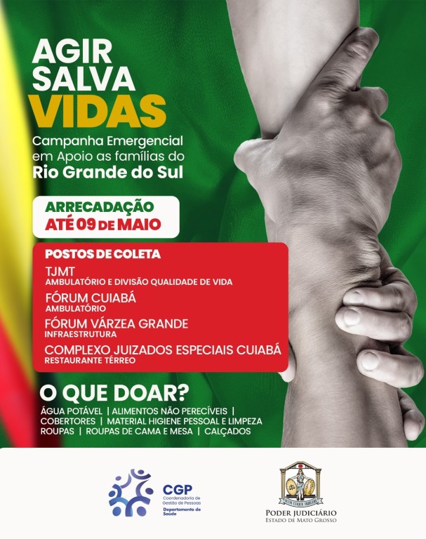 Esta matéria possui recursos de texto alternativo para promover a inclusão das pessoas com deficiência visual. Descrição da imagem: arte gráfica digital vertical da campanha. Ao fundo as cores verde, amarelo e vermelho, da bandeira do Rio Grande do Sul, à direita dois braços dados em preto e branco. Acompanha a arte o texto “agir salva vidas – campanha emergencial em apoio às famílias do Rio Grande do Sul – arrecadação até 09 de maio, postos de coleta TJMT ambulatório e divisão de qualidade de vida, Fórum Cuiabá ambulatório, Fórum Várzea Grande infraestrutura, Complexo Juizados Especiais Cuiabá restaurante térreo. O que doar? Água potável, alimentos não perecíveis, cobertores, material higiene pessoal e limpeza, roupas, roupas de cama e mesa, calçados. Assinam a peça os logos da Coordenadoria de Gestão de Pessoas e do Poder Judiciário de Mato Grosso.