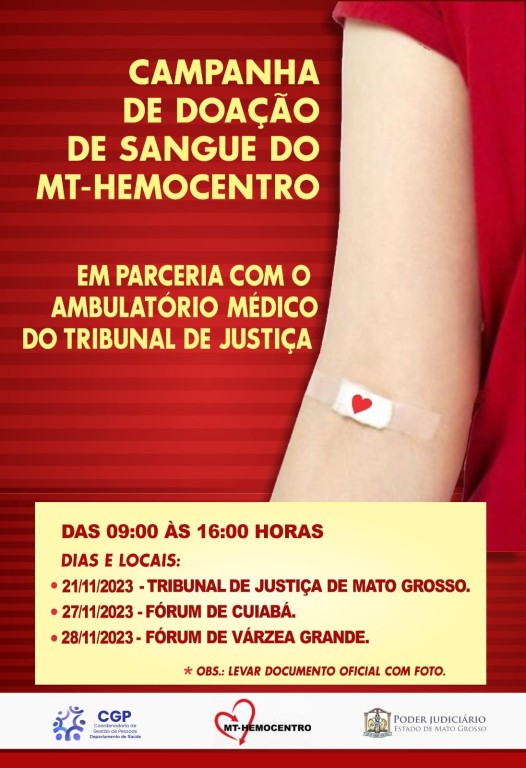 O Tribunal de Justiça, por meio do Departamento de Saúde, realizará Campanha de Doação de Sangue no Tribunal de Justiça e nos Fóruns de Cuiabá e Várzea Grande, em parceria com o MT Hemocentro. O Hemobus, ônibus do Hemocentro, estará, das 9h às 16h, na sede do Tribunal de Justiça dia 21 de novembro (terça-feira), integrando a ‘5ª Feira da Saúde’, no Fórum de Cuiabá dia 27/11 e no Fórum de Várzea Grande dia 28 de novembro.
