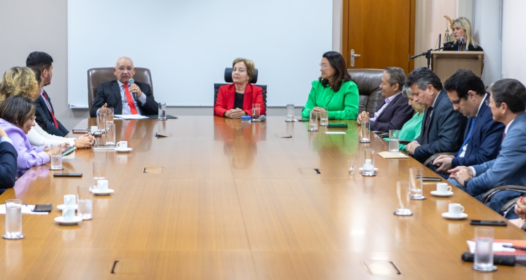 Primeira imagem: fotografia colorida mostrando a mesa de reunião com todos os participantes. A frente a desembagadora presidente, ladeada do corregedor e da desembargadora supervisora do Núcleo de Cooperação Judiciária.