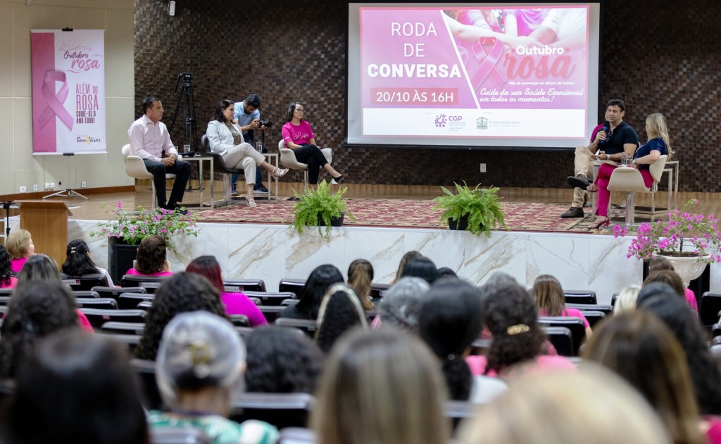 #Paratodosverem. Esta matéria possui recursos de texto alternativo para promover a inclusão das pessoas com deficiência visual. Foto 01: Roda de conversa em cima do palco do auditório Gervásio Leite. Em cima do palco estão seis pessoas posicionadas em meio círculo. Ao fundo, está projetada a arte do evento com os dizeres “Roda de Conversa, 20 de outubro às 16 horas. Outubro Rosa, mês de prevenção ao câncer de mama. Cuide da sua saúde emocional em todos os momentos”. O palco está decorado com flores cor-de-rosa. Foto 02: Presidente Clarice Claudino fala ao púlpito. Ela usa terno, blusa e colar rosa. Os cabelos são curtos e loiros.